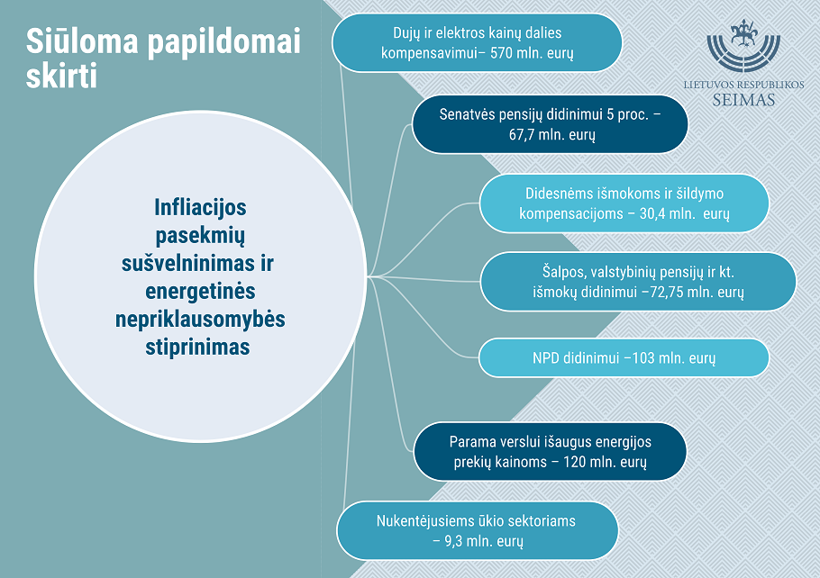 Biudžeto projekte – 0,4 mln. eurų siūloma skirti naujai partijai „Vardan Lietuvos“ finansuoti Gamta Užsienyje Verslas 2022-04-142022-04-14 Biudžeto projekte 0,4 mln. eurų siūloma skirti Vyriausiajai rinkimų komisijai – naujai politinei partijai „Vardan Lietuvos“ finansuoti. www.siandien.info; Seimo Informacijos ir komunikacijos departamento Spaudos biuro vyriausioji specialistė Saulė Eglė Trembo Seimui pristatytas šių metų valstybės biudžeto tikslinimo projektas Nr. XIVP-1499 ir lydimieji teisės aktai, parengti siekiant sušvelninti infliacijos pasekmes ir stiprinti energetinę nepriklausomybę, teikiant pagalbą karo pabėgėliams bei palaikant kritinę nacionalinę infrastruktūrą ir saugumą. „Pakeitimas inicijuotas atsižvelgiant į pasikeitusią ekonominę situaciją. Pirmiausia dėl to, kad įvyko Rusijos invazija į Ukrainą, ir tai iš esmės pakeitė tiek visos Europos Sąjungos, tiek ir mūsų valstybės ekonomines prognozes, taip pat – energijos kainų ir būsimosios infliacijos projekcijas, ir tai pareikalavo papildomų pakeitimų“, – pristatydama siūlymus sakė finansų ministrė Gintarė Skaistė. Įstatymo projektu numatoma, kad 2022 metų valstybės biudžeto pajamos kartu su Europos Sąjungos ir kitomis tarptautinės finansinės paramos lėšomis būtų 5,1 proc. didesnės nei šiuo metu patvirtintame 2022 metų valstybės biudžeto plane, išlaidos – 5,2 proc. didesnės. Daugiausia pajamų tikimasi surinkti iš pridėtinės vertės mokesčio (toliau – PVM) – 440,9 mln. eurų; pelno mokesčio – 172,3 mln. eurų; gyventojų pajamų mokesčio – 119,7 mln. eurų. Kito materialiojo ir nematerialiojo turto realizavimo pajamos didinamos 52,8 mln. eurų; loterijų ir lošimų mokesčio pajamos – 2 mln. eurų; pajamos iš dividendų ir valstybės įmonių pelno įmokų – 1,9 mln. eurų. Teikiamame projekte numatytos lėšos priemonėms, skirtoms energijos išteklių ir kitų prekių kainų kilimui švelninti. Pasak ministrės, energijos (ypač gamtinių dujų) kainos tarptautinėse rinkose nusistovėjo itin aukštame lygyje, jos yra keletą kartų didesnės nei buvo praėjusių metų pradžioje; be to, iš ateities sandorių matosi, kad tokios tendencijos išsilaikys dar bent metus ar pusantrų, todėl Vyriausybė siūlo išlaikyti tą pačią kainų augimo tendenciją, kuri buvo siūloma iki šiol, ir užtikrinti, kad kainos nuo liepos 1 dienos augtų apie 40 proc., likusią dalį subsidijuojant iš nacionalinio biudžeto lėšų. „Šis sprendimas yra tikrai labai brangus, tačiau reikalingas, nes nieko nedarant, akivaizdu, kad poveikis žmonių biudžetams būtų itin sudėtingas. Energijos prekių pakaitumas yra sunkus, pereinamasis laikotarpis taip pat yra reikalingas, net ir žmonėms, kurie nori pereiti prie kitokios energijos naudojimo: ar įsigyti saulės elektrines, ar pakeisti dujų katilus, tam taip pat reikalingas prisitaikymas, kaip ir elektros tinklo prie naujų vartotojų. Toks perėjimas negali būti greitas, todėl siūlomi tam tikri sprendiniai, kurie galėtų būti laikini, kol būtų galima su Europos Sąjungos struktūrinių fondų pagalba, finansinių priemonių pagalba padėti žmonėms persiorientuoti prie kitų energijos šaltinių“, – sakė finansų ministrė G. Skaistė. Biudžeto tikslinimo projekte siūlomos ir lėšos pagalbos priemonėms dėl Rusijos Federacijos karinės invazijos į Ukrainą. Kalbėdama apie ukrainiečiams skiriamas lėšas, finansų ministrė pabrėžė, kad šie žmonės bėga nuo karo, dažnai neturėdami nei namų, kur bėgti, nei daiktų ar kitų dalykų, ir jiems reikalinga mūsų parama: „Reikia parodyti solidarumą ne tik žodžiais, bet taip pat ir skiriamomis lėšomis socialinei paramai – tai reiškia išmokoms vaikams, socialinei pašalpai, vienkartinėms įsikūrimo išmokoms, kompensacijoms, maisto paketams ir kortelėms“. G. Skaistė atkreipė parlamentarų dėmesį, kad šiuo metu pasakyti, kiek tam reikės lėšų iki metų pabaigos yra gana sudėtinga, kadangi labai daug kas priklausys nuo karo eigos ir trukmės. Teikiamu šių metų valstybės biudžeto tikslinimo projektusiūloma skirti lėšų geležinkelių infrastruktūros išlaikymo išlaidoms, atsiradusioms dėl sankcijų Baltarusijos Respublikai taikymo; pasirengti 2023 metais vyksiančiam NATO viršūnių susitikimui (transporto priemonėms, patikros įrangai, stebėjimo sistemoms, kompiuterinei ir kitai įrangai įsigyti). Naujai politinei partijai „Vardan Lietuvos“, kuriai vadovauja S. Skvernelis, bus skirta 0,4 mln. 52,8 mln. eurų siūloma skirti valstybės paramai pagal Daugiabučių namų atnaujinimo (modernizavimo) programą viešiesiems centrinės valdžios pastatams atnaujinti ir mažiau taršaus transporto įsigijimui ir (arba) panaudojimui skatinti. Biudžeto projekte 0,4 mln. eurų siūloma skirti Vyriausiajai rinkimų komisijai – naujai politinei partijai „Vardan Lietuvos“ finansuoti. Pristačius biudžeto projektą pagrindiniu svarstyti šį klausimą paskirtas Biudžeto ir finansų komitetas. Seimo posėdyje svarstymo procedūra numatyta balandžio 28 d. Share on Facebook Share Share on TwitterTweet Share on Pinterest Share Share on LinkedIn Share Share on Digg Share